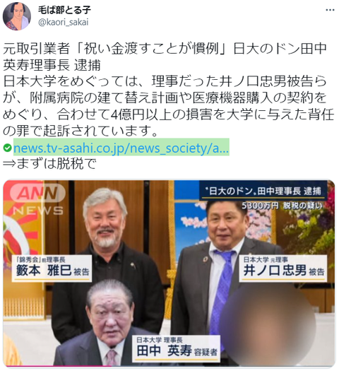 ・日大の田中英寿理事長を逮捕 所得税5300万円脱税の疑いで東京地検特捜部