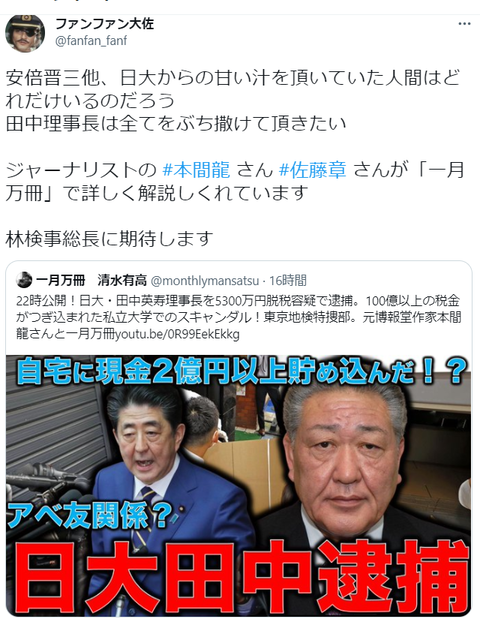 とりあえず、脱税で日大理事長逮捕・・・「俺が逮捕されれば裏金のことも全部ぶちまける」って言ってたんだから、お楽しみはこれからだ!!