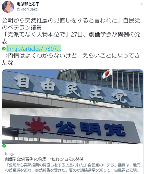 連合会長の反共・芳野君の頑なな共産党排除のおかげで、野党共闘にヒビが入って、このままだとこの夏の参議院選は野党大敗かと思っていたら、なんと自民党と公明党の関係にもすき間風が吹き始めているってね。