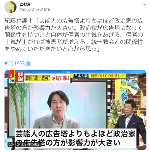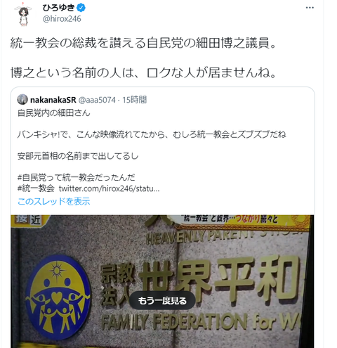 0:56から、統一教会の現教祖に対して、「敬意を表する」と明らかに言っている。統一教会の霊感商法、脅し文句を並べての壺売りや献金と称してほぼ強制的に全財産を巻き上げるやり方、知らなかったですむことではない。